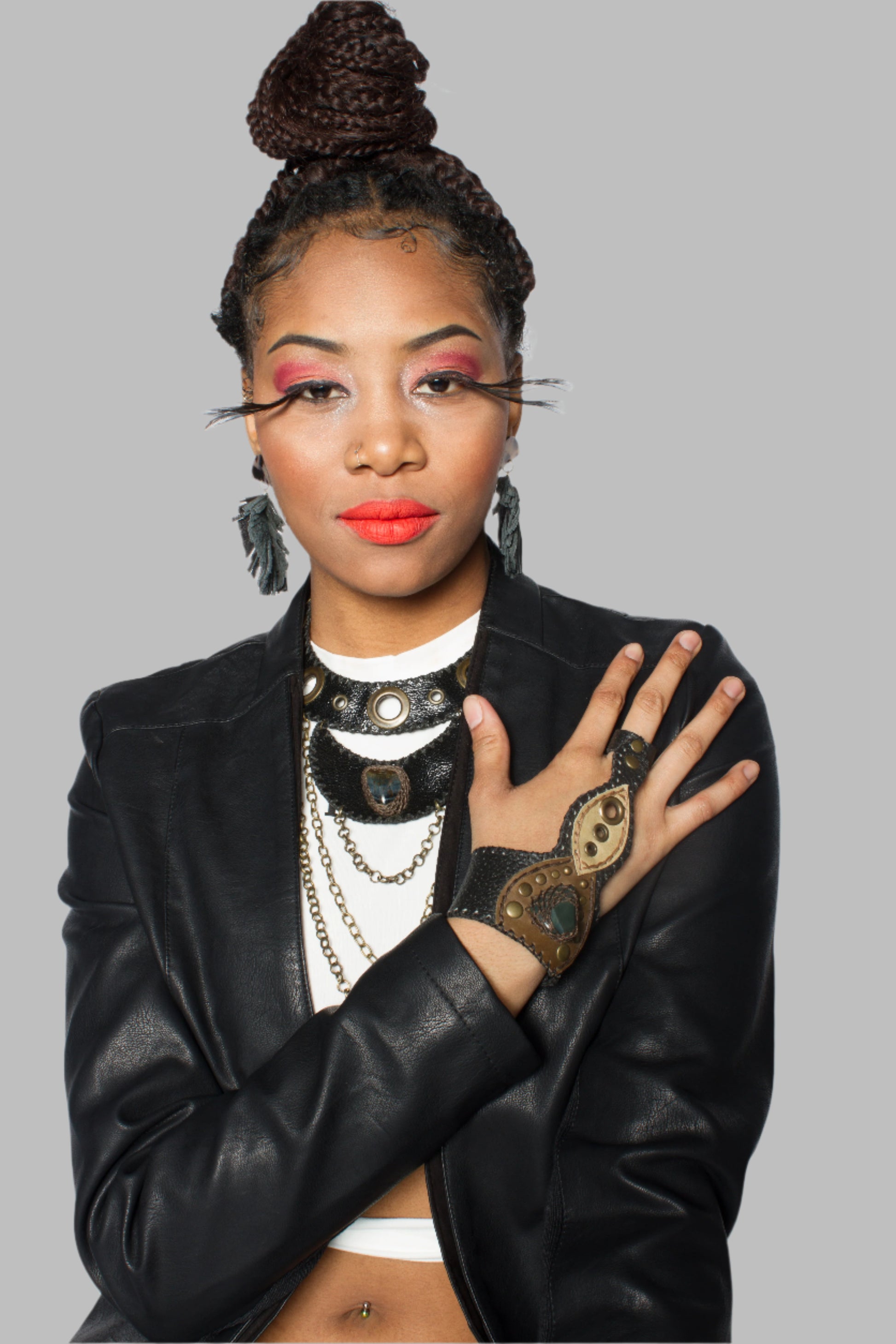 Rule in mystery and metal with the Shadow Empress collar. Crafted from black leather with distressed brass grommets and cascading antique gold chains, this commanding design features a central obsidian-like stone for grounded power and allure. Tribal yet futuristic, this piece is made to turn heads at festivals, rituals, or dark couture events.
