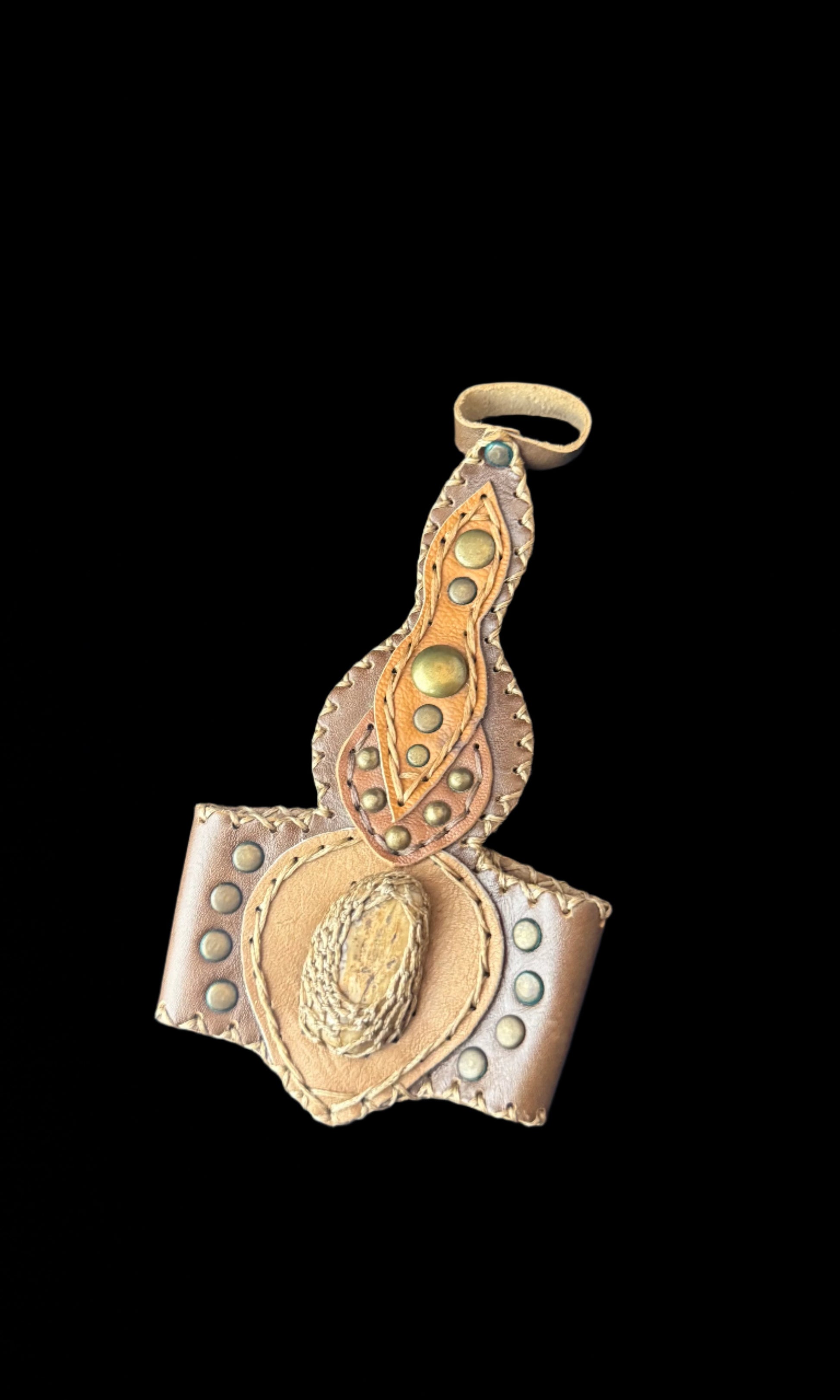 - Materials: Genuine hand-stitched leather, brass studs, natural Jasper gemstone (or Agate)