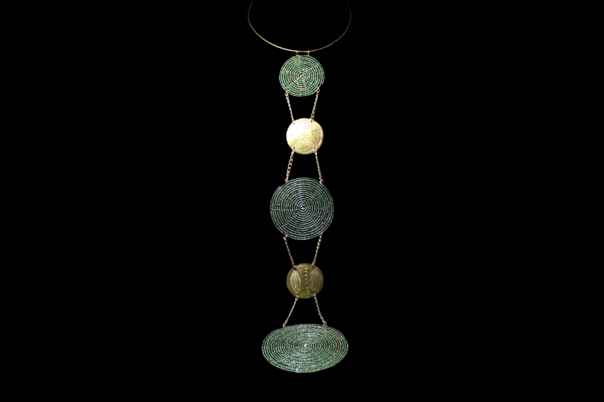 Celebrate legacy, motion, and the sacred rhythm of tradition with Circles of Life. This striking vertical necklace blends hand-beaded spiral medallions in deep earth-toned green with etched gold-tone coins, each symbolizing continuity, growth, and balance. Suspended from a sleek collar choker, this wearable art piece captures the spirit of African elegance—powerful, graceful, and eternal.