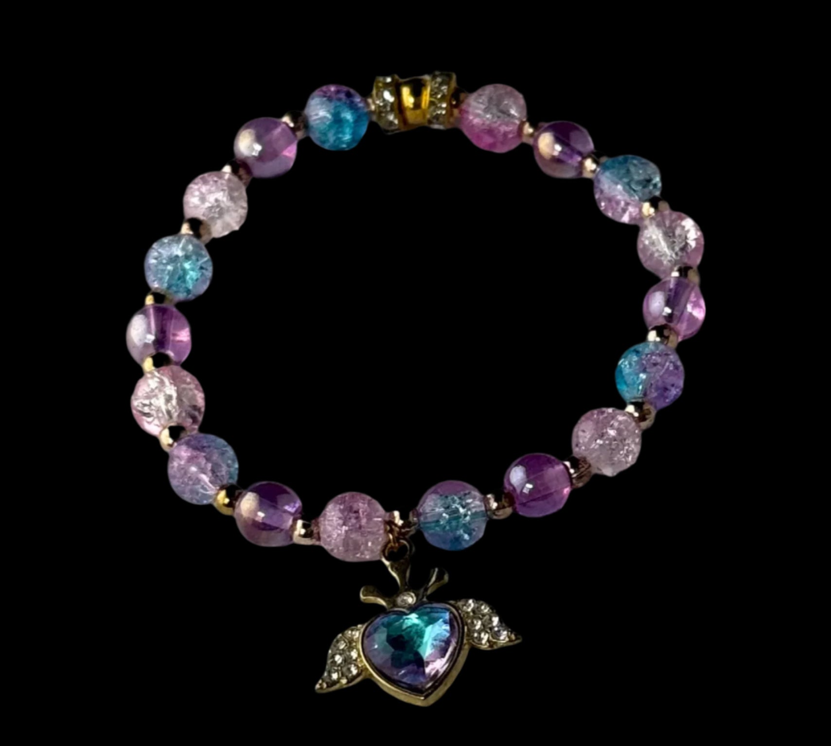 Sweet like candy, bold like love. Love Buzz is a handcrafted stretch bracelet that brings playful elegance to your wrist. With radiant crackle-glass beads in shimmering pinks, purples, and blues — all crowned with a dazzling jeweled heart-wing charm — this piece is pure joy, wrapped in sparkle.