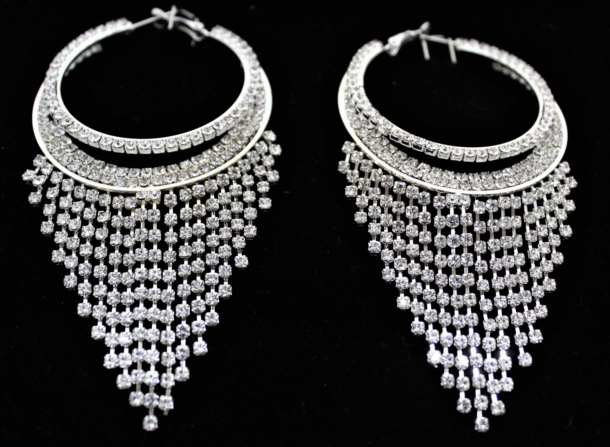 Channel vintage luxury and modern sparkle with our Gatsby Glimmer Earrings. These dazzling statement hoops feature double rows of shimmering crystals paired with a cascading fringe of rhinestone chains that sway with your every move, creating a show-stopping waterfall of light and elegance.